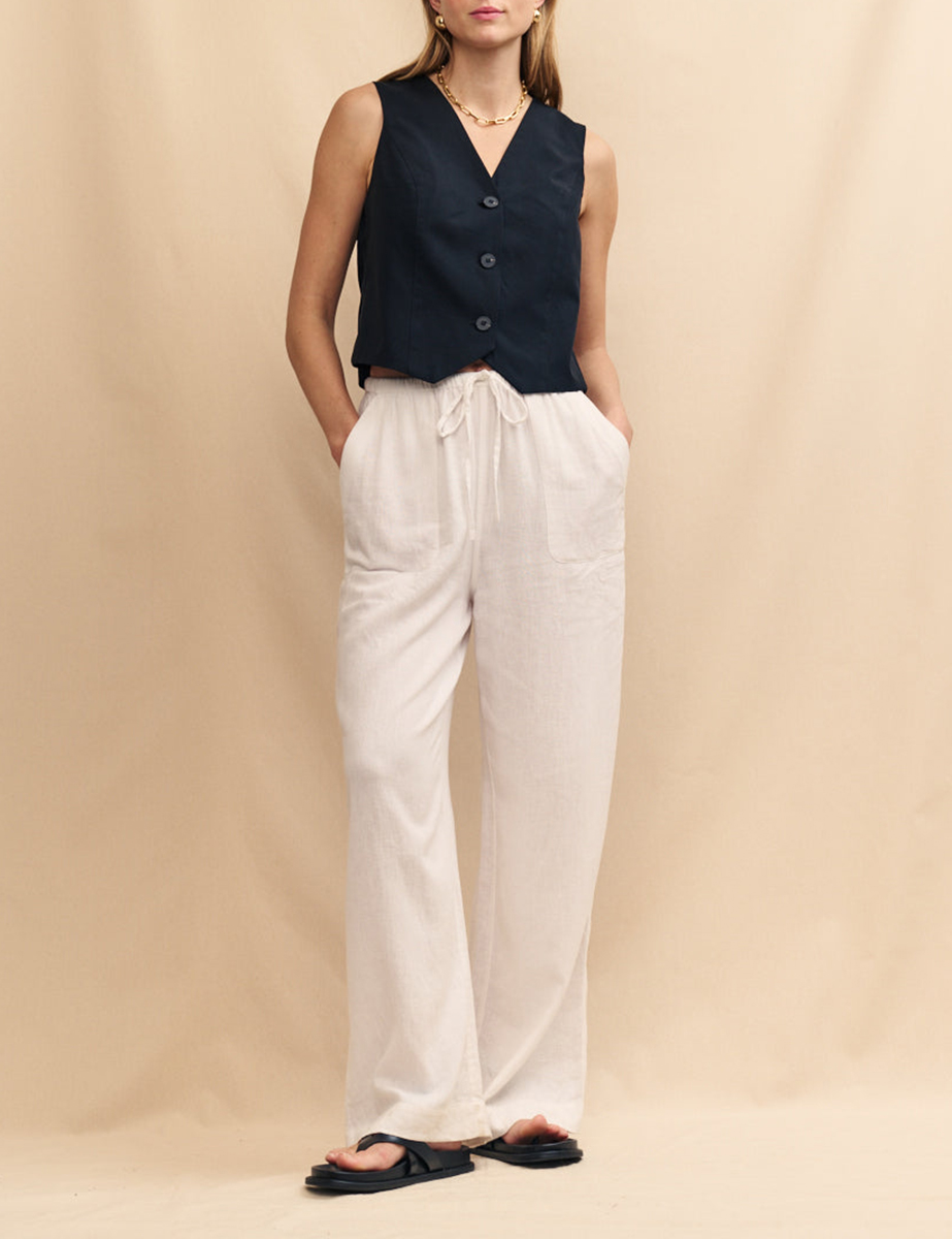 A classic black waistcoat. This plant-based fabric looks just as polished as it feels. The boxy fit makes it perfect for relaxed summer plans. Finish yours with stacks of gold jewellery.
