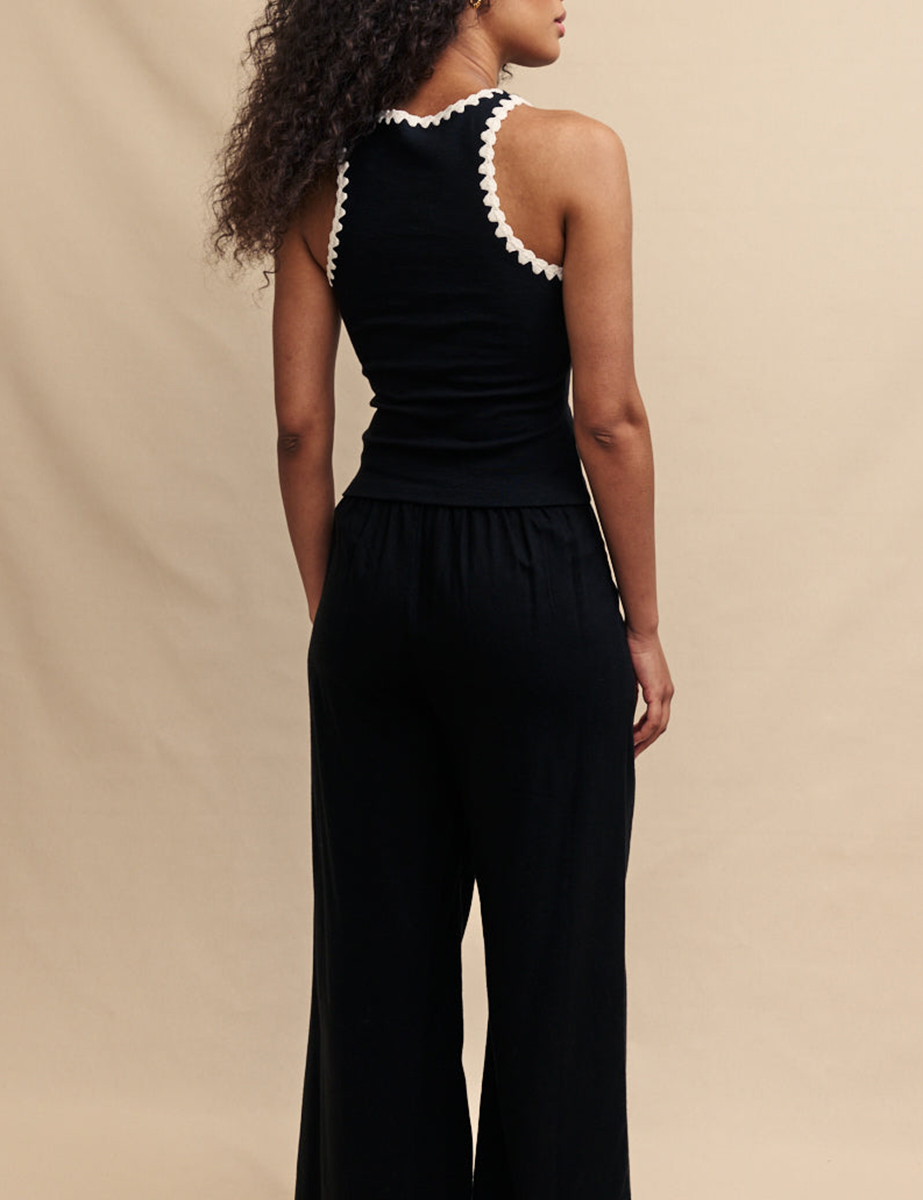 An elevated take on the classic racer. Trimmed with handmade crochet, this responsibly made black top is anything but basic. Expertly crafted entirely from organic cotton, it’s perfect for summer. Style yours with wide leg trousers.
